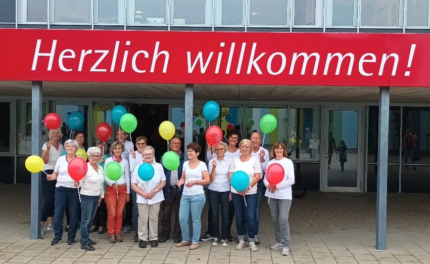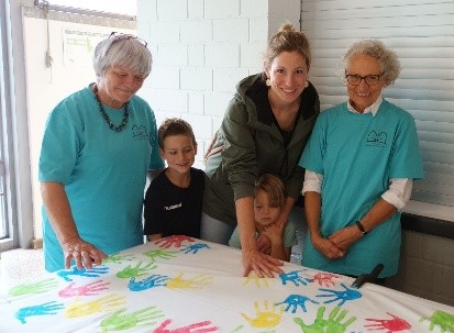 Viele Eindrücke durften wir hören und sehen: „Oh schön, das muss ich weitersagen“- „Die ausliegenden Prospekte sind gut“. Auf die Frage – „Ist das ein Flohmarkt?“, konnten wir von der Nachbarschaftshilfe darüber informieren, dass es sich hierbei um aktivierende Betreuungsmaterialien für demenziell Erkrankte handelt. Diese Materialien werden bei Betreuungen durch die Nachbarschaftshilfe eingesetzt und können jederzeit auch ausgeliehen werden. – „Große und Kleine Besucher“ druckten begeistert ihre Hände farbig auf ein großes Stofftuch. Dies war eine gelungene Gemeinschaftsaktion zum Thema „Was Hände“ alles bewirken können. Zu guter Letzt, verteilten noch die Engagierten der Nachbarschaftshilfe Luftballone an die zahlreichen Kinder, die sich sehr darüber freuten.