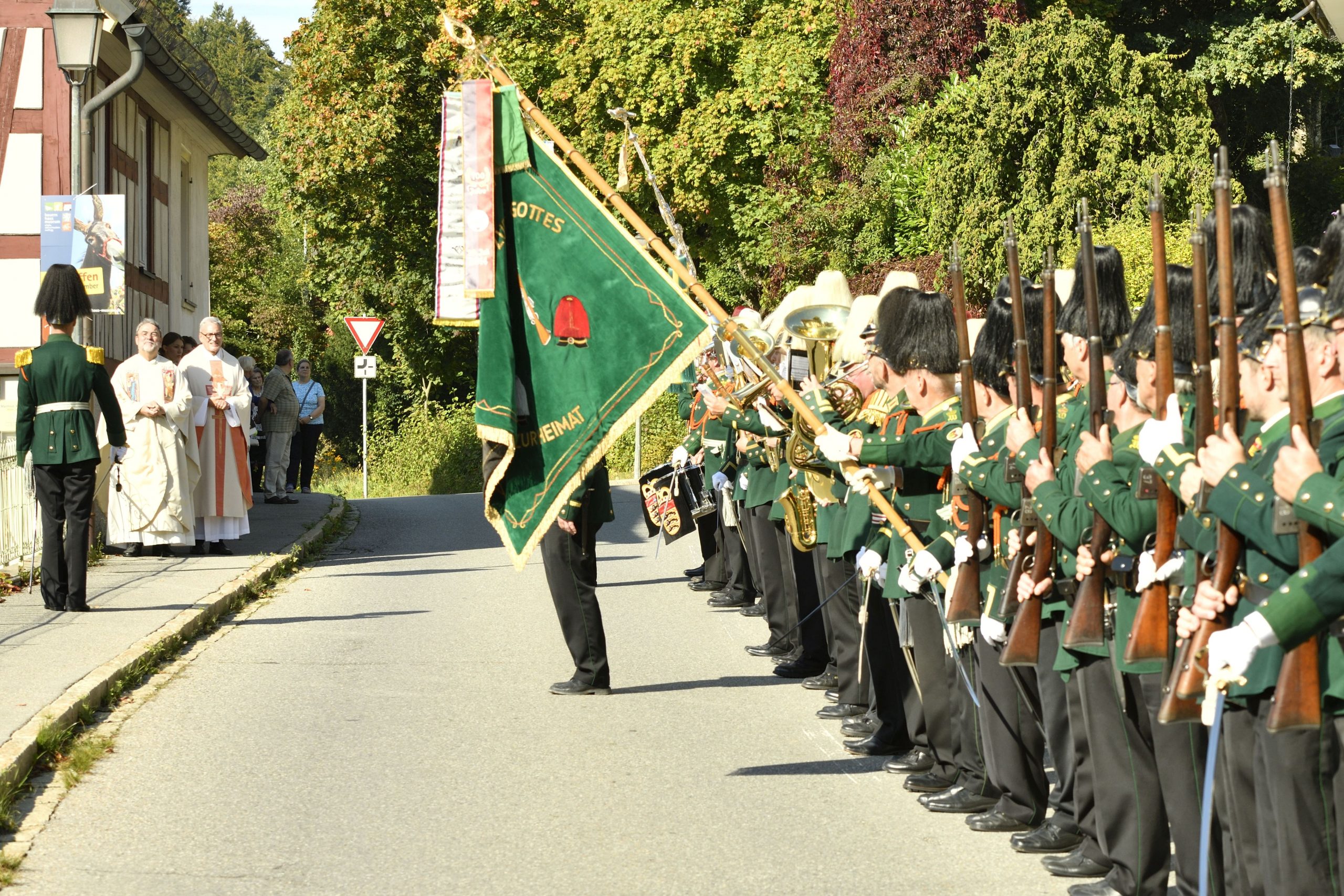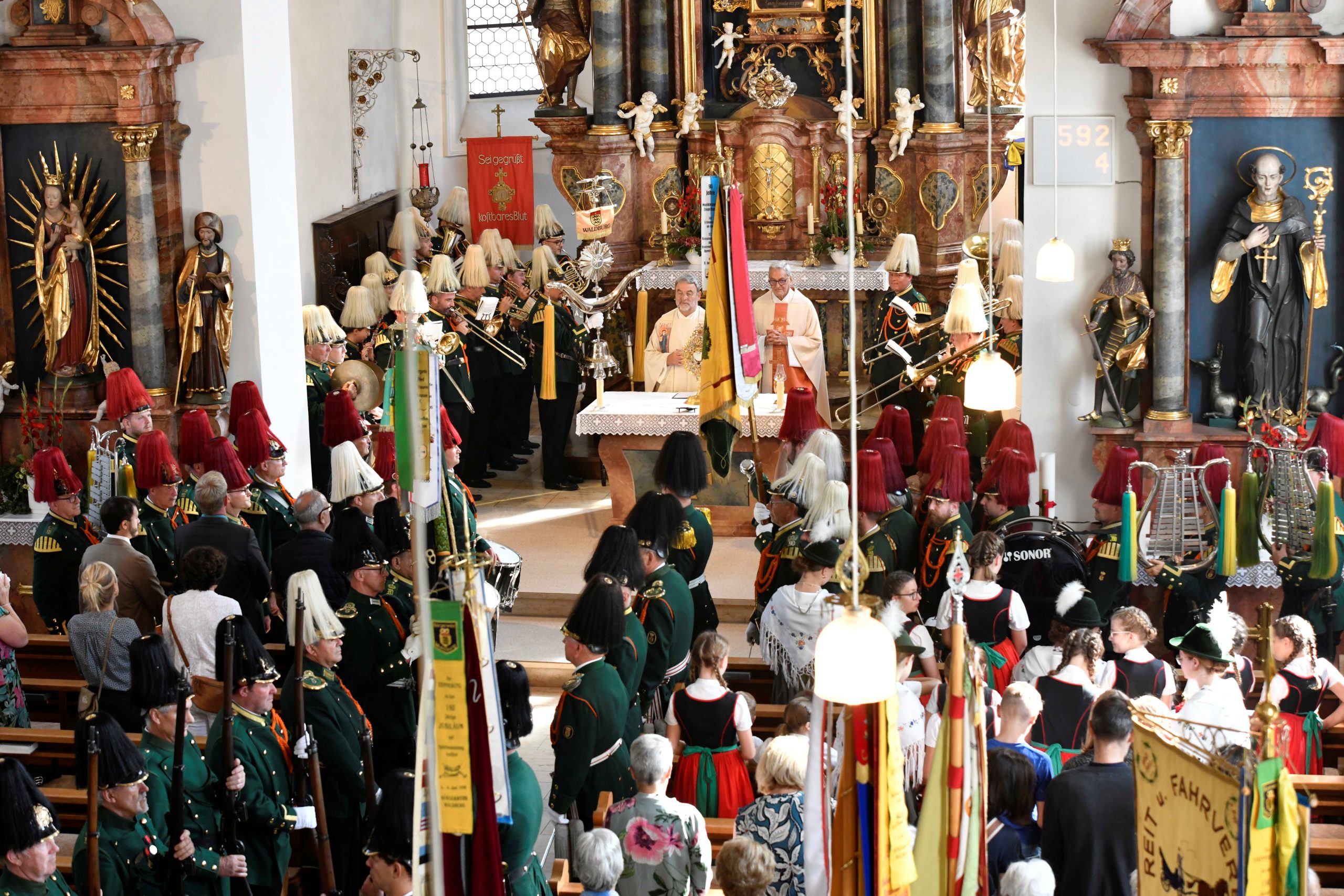 Festprediger und Hauptzelebrant Prälat Rudolf Hagmann, Pfarrer Edgar Briemle sowie die Ministranten wurden am Gemeindehaus von der historischen Bürgerwehr und den Fahnenabordnungen empfangen und feierlich in die Kirche geleitet.